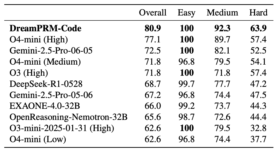 - 2026/1. Our DreamPRM-Code method achieves first place on the LiveCodeBench Coding Benchmark(2/1/2025-5/1/2025).